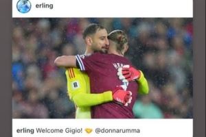 哈兰德此前在社交媒体晒出自己与多纳鲁马拥抱的照片,并配文:“欢迎你,多纳鲁马!”